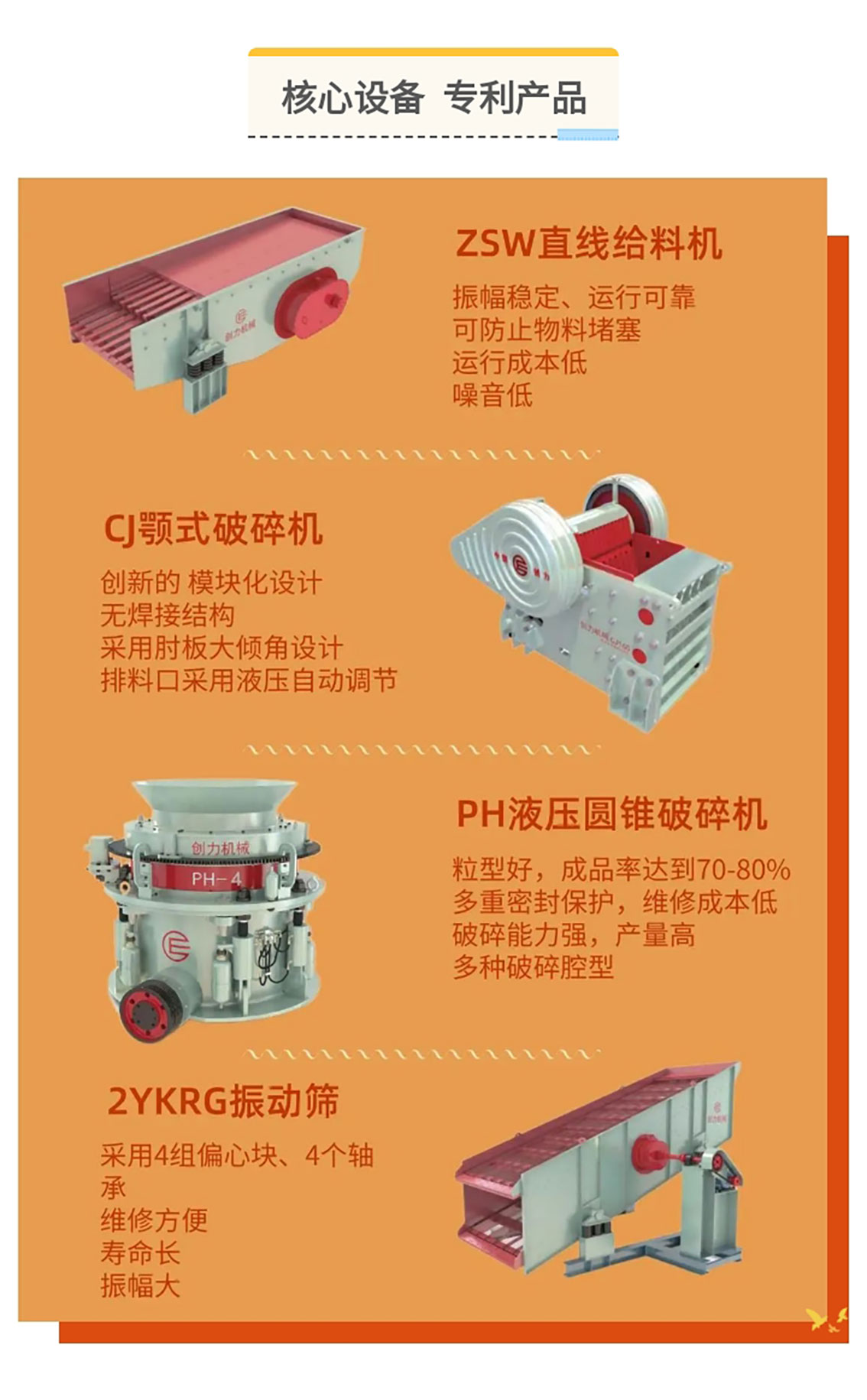 公司的主要產(chǎn)品PH系列多缸液壓高效圓錐機(jī),是目前世界上最先進(jìn)的、自動(dòng)化程度最高的圓錐機(jī)。公司還生產(chǎn)與之配套的顎式破碎機(jī)、反擊式破碎機(jī)、給料機(jī)、振動(dòng)篩等系列產(chǎn)品,同時(shí)單缸液壓圓錐機(jī)及高速顎式破碎機(jī)、旋回式破碎機(jī)、制砂機(jī)等已成功研發(fā),為企業(yè)開(kāi)拓了廣闊的市場(chǎng)前景。